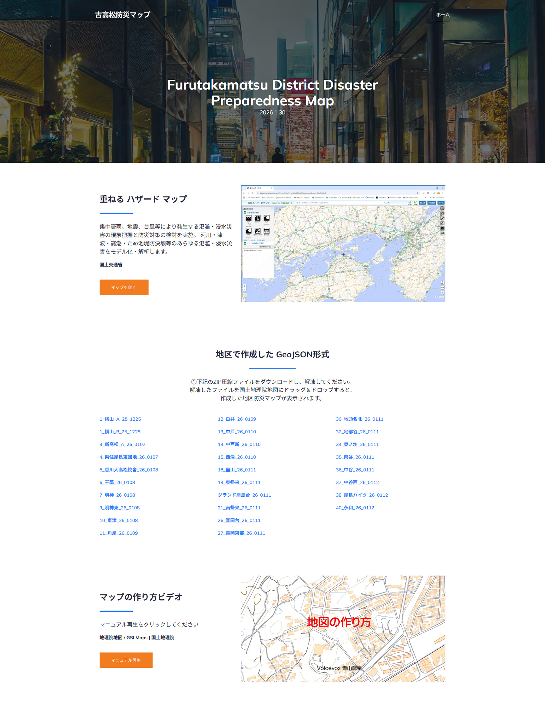 国土交通省の「重ねるハザードマップ」を活用し、地区防災計画マップを制作しました。GeoJSONデータを用いて情報を共有・更新することで、いつでも最新の状況に書き換えが可能な手法です。