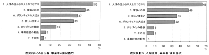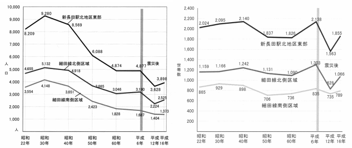 | 震災直前、約6割が借家世帯であったが、震災後は細田線北側で7.5割、細田線南側で5.7割が持地持家となり、借家中心だった地域が持家層を中心とした地区へと逆転した。 |