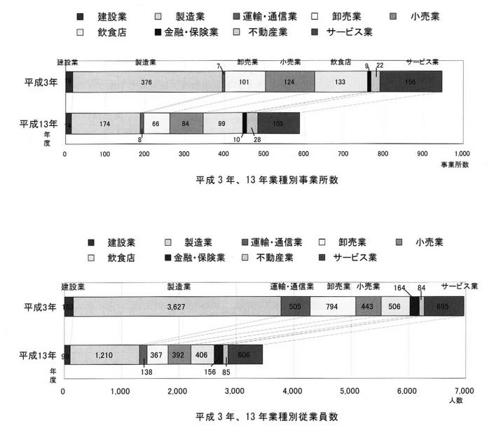 事業所は、震災前の平成3年の946から13年には588となり、6.2割と減少。