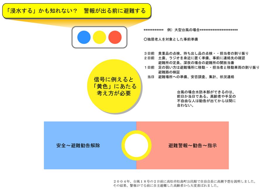 ■行政の出す『赤信号』より地域のことを良く知っている地域のリーダーの出す『黄信号』を共有し、いち早い行動へとつなげる。