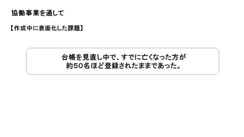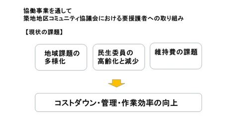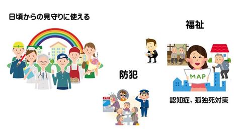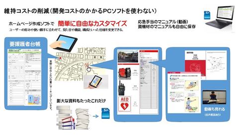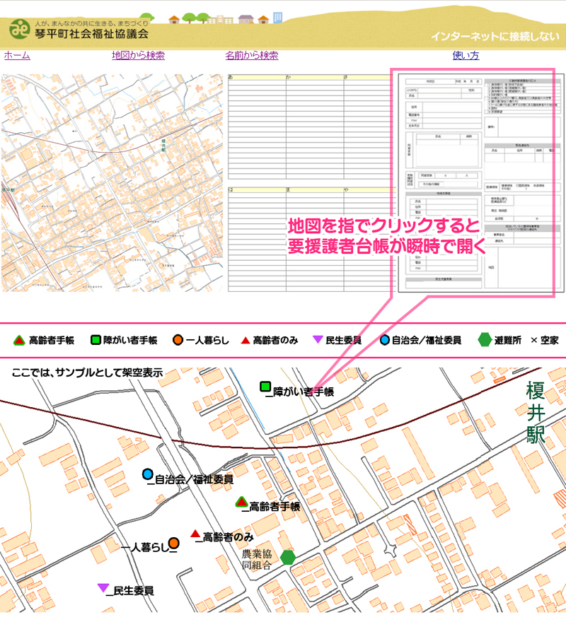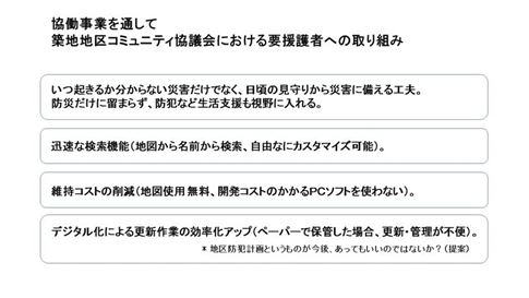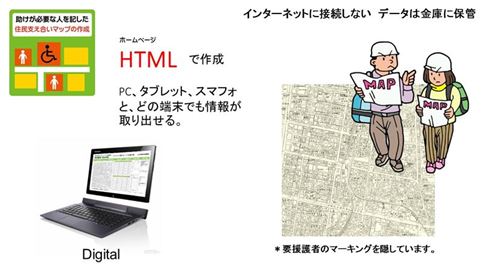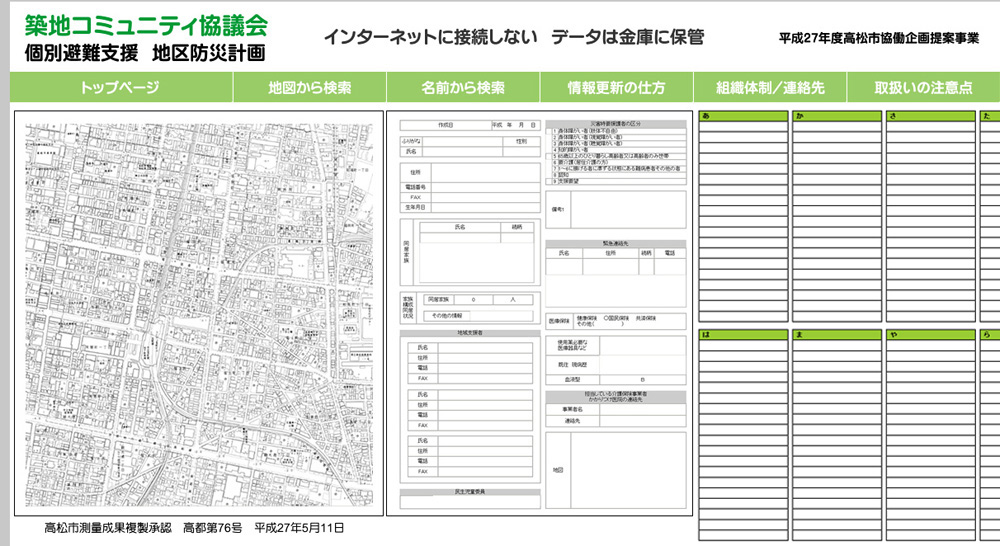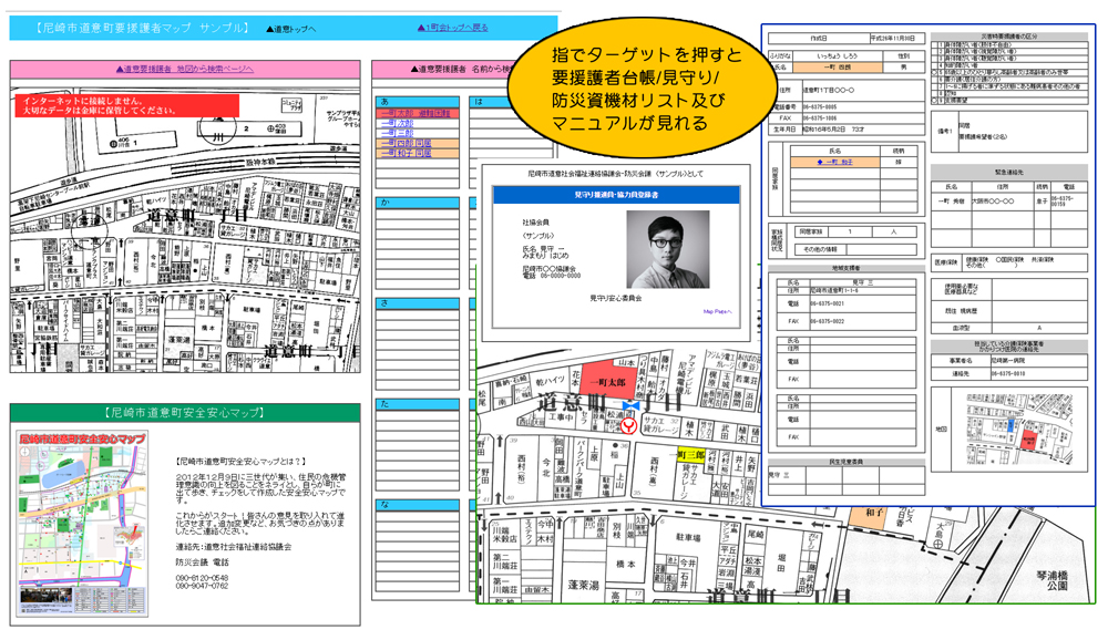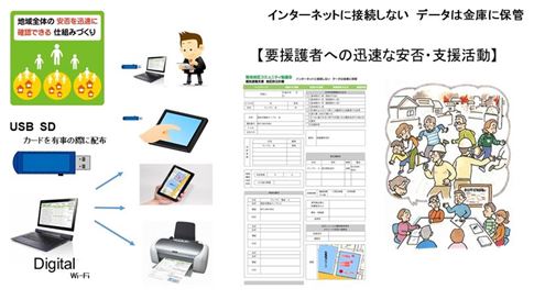 要配慮者への日頃の見守りから災害時における災害時要援護者台帳を検索機能のある地図に埋め込む。地図だけでなく、名前、優先順位から要援護者と見守り担当リスト及び防災資機材リスト、マニュアルなどを検索して瞬時に表示。地域見守り支援者代表が自ら更新できるように技術習得。データは、金庫に保管。端末は、インターネットの接続禁止。回線を切断。この周知と実行を徹底。