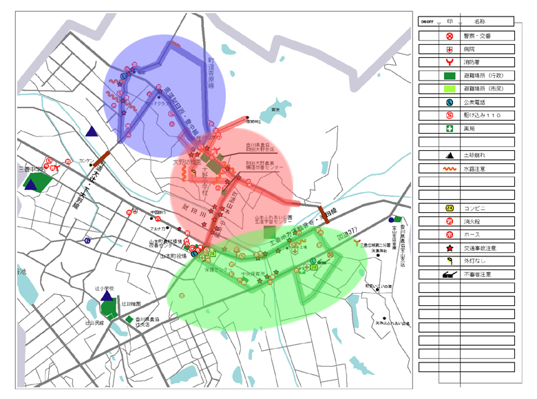 下の地図で見たい場所をマウスで押すとみんなで作った防災防犯マップが開きます。