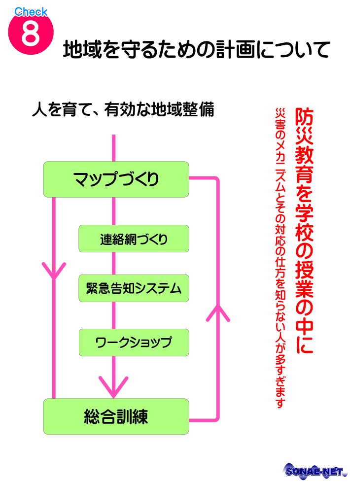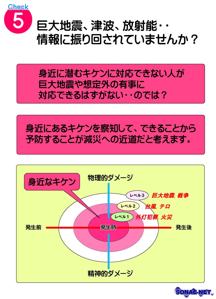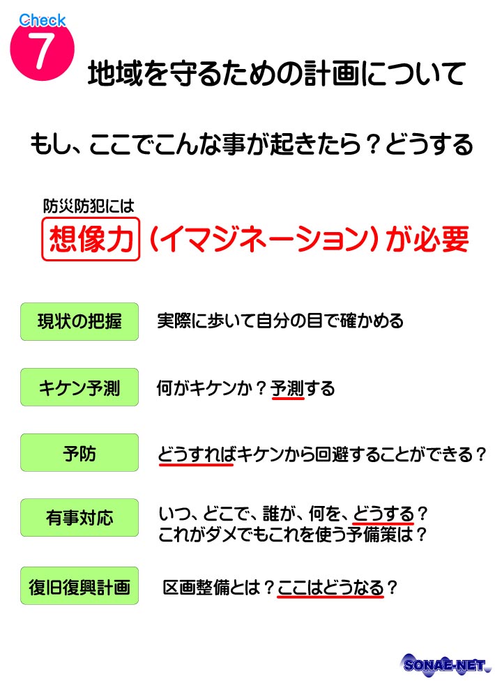 そこで、私たちSONAE−NETでは地域住民の防災・防犯活動を支え、ハード、ソフトの両面においての地域全体のコミュニティーを発展させ、災害や犯罪に強い地域をつくり、地域社会の公益に寄与したいと考え、特定非営利活動法人SONAE−NETの設立を企図しました。
